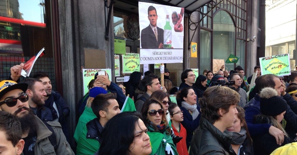 Um dos cartazes diz "Brasil quer Lula na cadeia!"